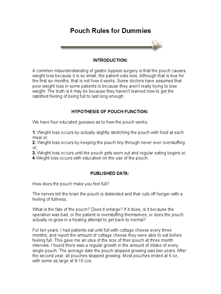 Pouch rules for dummies. See more ideas about bariatric recipes bariatric sleeve surgery. The pouch works best when the outlet is not too small or too large and the pouch itself holds about 1 ½ cups at a time. March 25 2016 Aftercare Bariatric gastric bypass pouch Gastric Bypass Pouch Failure.