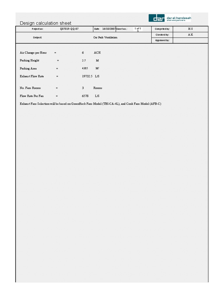 SMOKE MANAGEMENT DESIGN CALCULATION SHEET. Our car park fans operate on well-proven tunnel ventilation principles producing a high velocity jet that as it diffuses imparts thrust to the surrounding air through mixing and entrainment. Car Park Ventilation System Design - Calculation Excel Sheet. Sections of this page. Fire Size A 4 x 360. Method of McCaffrey Quintiere and Harkleroad MQH 021_Temperature_NVxls v. Method of Foote PDF. Transformer Room Ventilation Generator Room Ventilation LT HT Panels Room Car Park Ventilation Atrium. Press alt to open this menu.